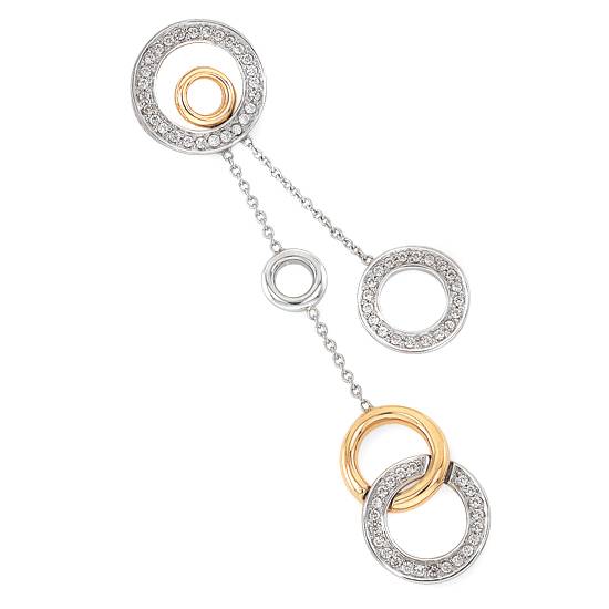This platnium pendant has double Y drop design. It comprises different size of loops and donut shape platnium in silver and gold color. There are bead-set white diamonds embellishing 3 loops.