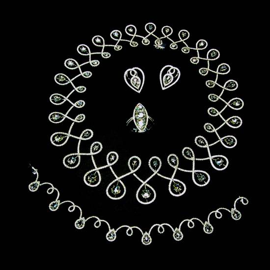 The jewellery set is made of platinum with sparkling diamonds. The necklace and the bracelet are in the scroll design with round and pear diamonds and other tiny ones for embellishments. The ring has a marquise diamond and the earrings have the pear diamonds.