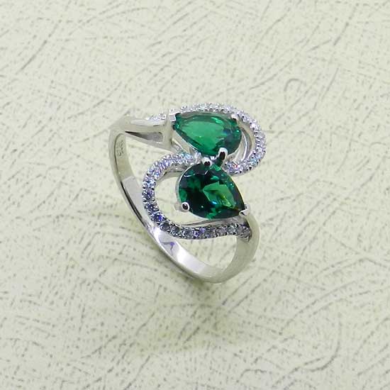 This stunning ring spotlights two drop-shaped green CZ stones split by the S-shaped ring band. The ring is accented with shimmering tiny white CZ stones in micro-pave setting. The platinum ring band exhibits a highly polished finish with long-lasting shine.