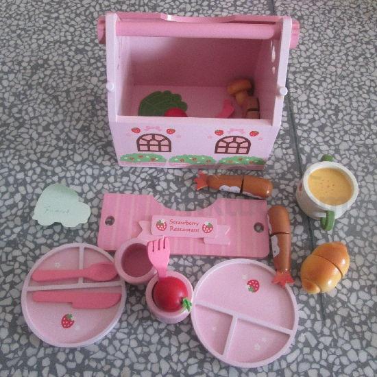 The presented toy set is ideal for playing pretend restaurant or other cooking games. Exquisitely made with wood material, the set features many appealing cutleries and food items. For added sweet touches, the toy pieces are decorated with strawberry patterns.