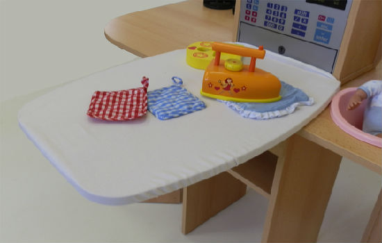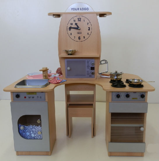 Seven in one play Kitchen contains: cooker, microwave, washing machine, clock, table with a hairdresser‘s seat and mirror, shop, ironing board, bath for a baby.