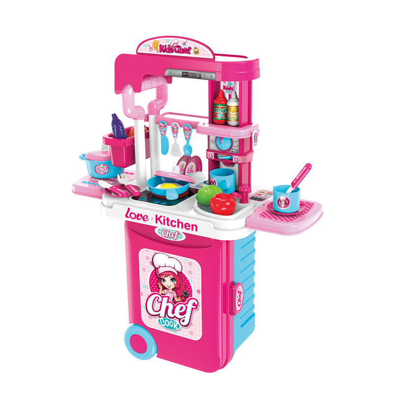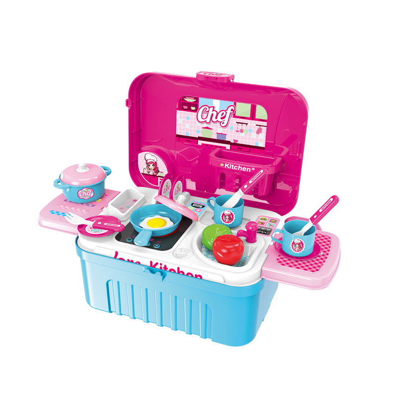 - A kitchen set with light and sound effects, housed in a suitcase.