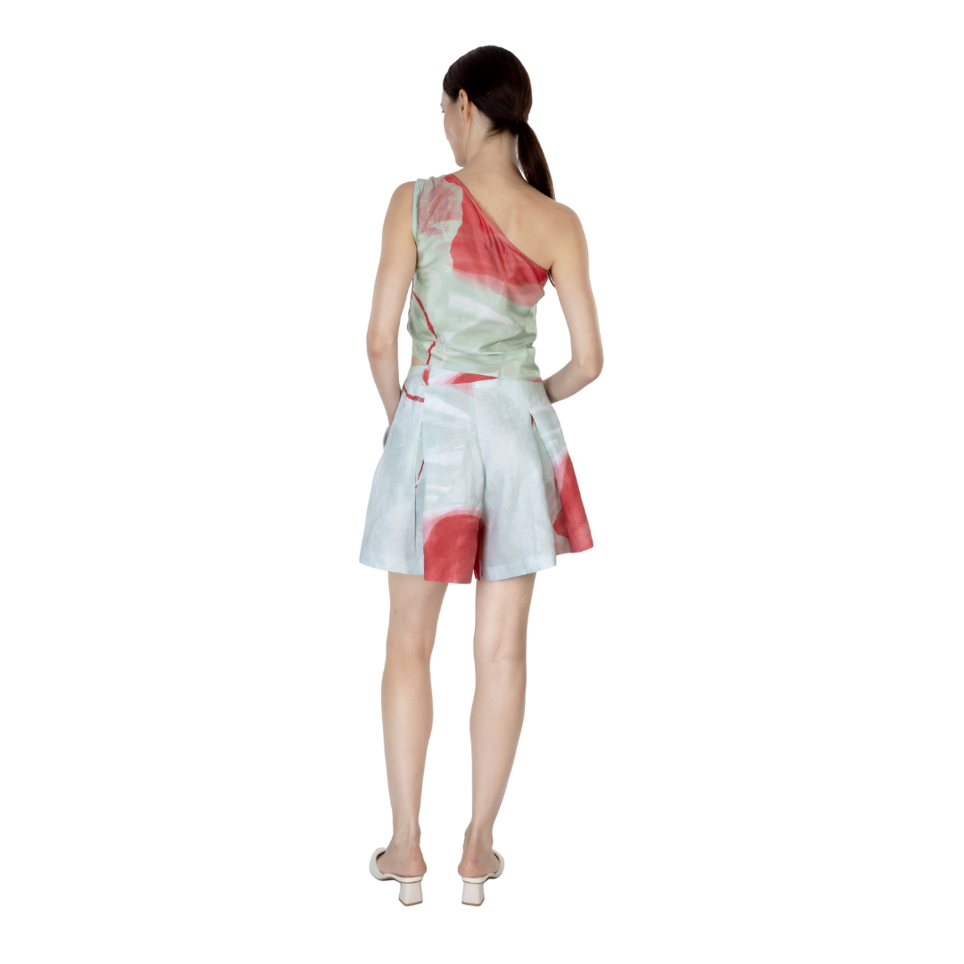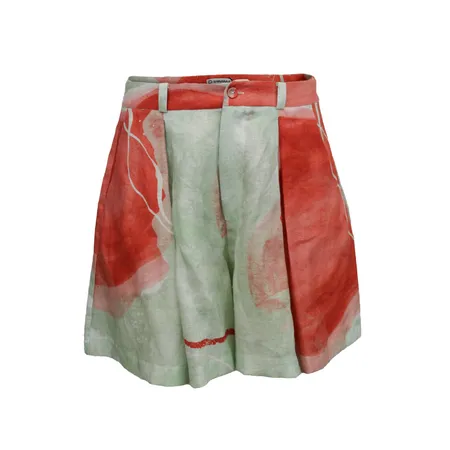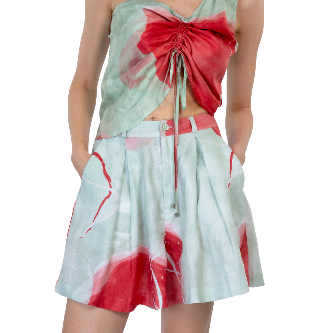 These expertly pleated shorts showcase our distinctive green print, harmoniously blending sustainable luxury with modern aesthetics. Each leg features defined pleats that create a refined silhouette, complemented by premium details at the front.