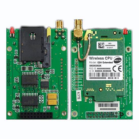 This plug-in board is a wireless ARM7 CPU® board. It is equipped with an open AT® operating system. It has an integrated SMA connector for a GSM antenna interface and an integrated SIM socket with a SIM tray.