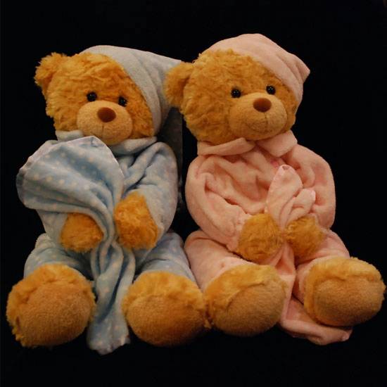 The lovely plush bear set comes in a pair, featured in pretty pajamas. They are made of 100% polyester for a soft hand feeling. These adorable bears will put your kid in a sweet dream.