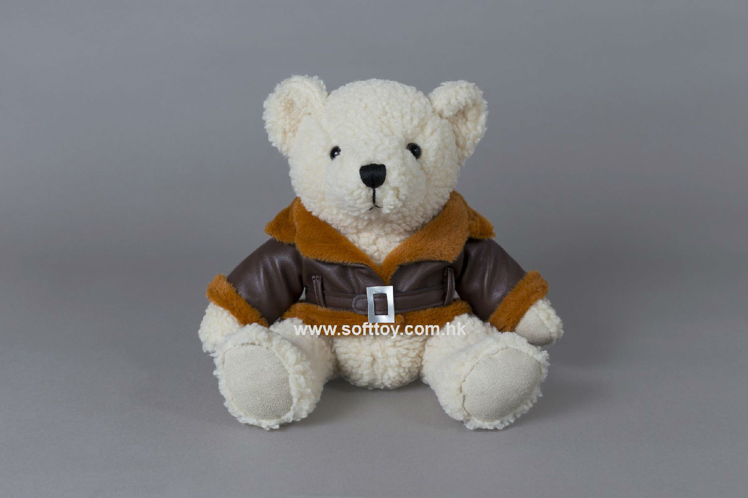 Cute plush bear wearing pilot faux leather jacket.   Bear body made with polyester plush.
