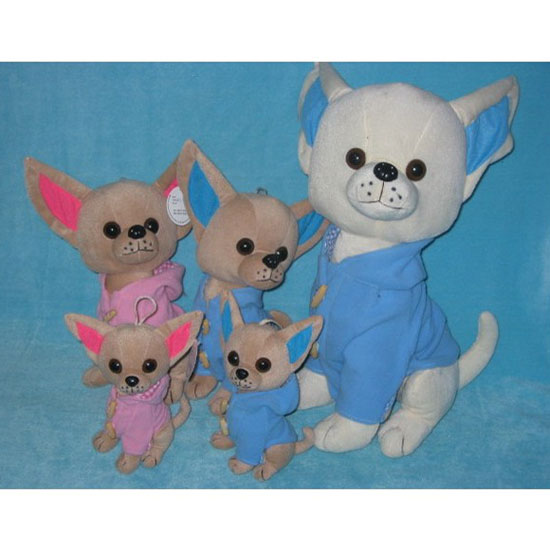 These adorable plush dogs feature the look of Chihuahua. The handsome plush dogs are dressed in pretty clothes for added appeal. The soft and velvety plush toys are best sleeping companions for kids.
