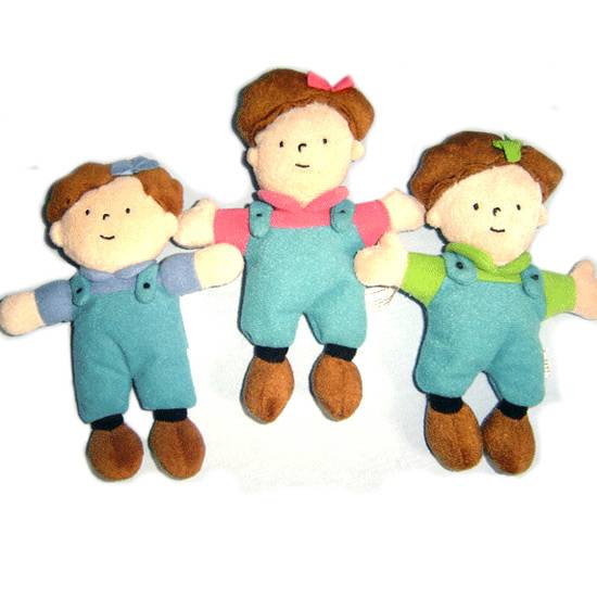 These are plush kids dolls that each of them has a knot on its head. They are identical in facial expressions but their garments are in different colours. Our company uses high quality fiber for stuffing to guarantee softness.
