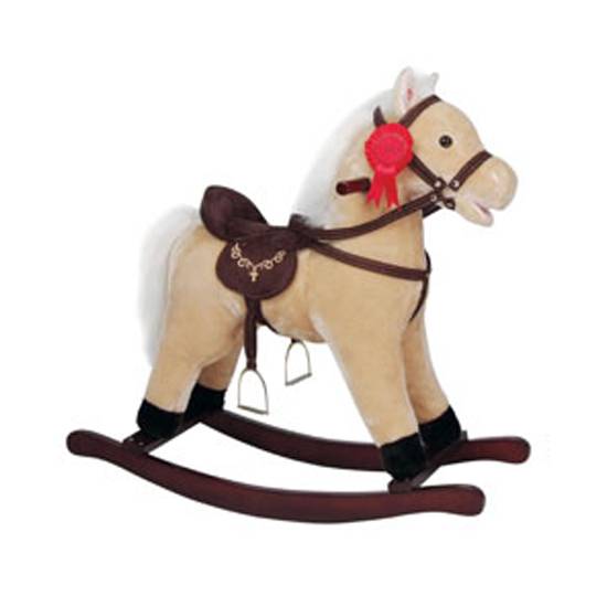 This adorable plush horse stands on a sturdy wooden rocker, rocking back and forth in a delightful way. Made of smooth and velvety material, it is incredibly soft and comfortable to touch. This lovely plush rocking horse is simply a precious addition to your child's bedroom.