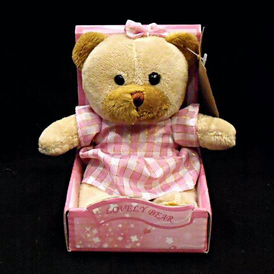 This plush teddy bear comes with a pink checkered one-piece dress and a ribbon. This stuffed toy bear has a soft and comfortable texture. This lovely bear is a suitable gift for your beloved girl.