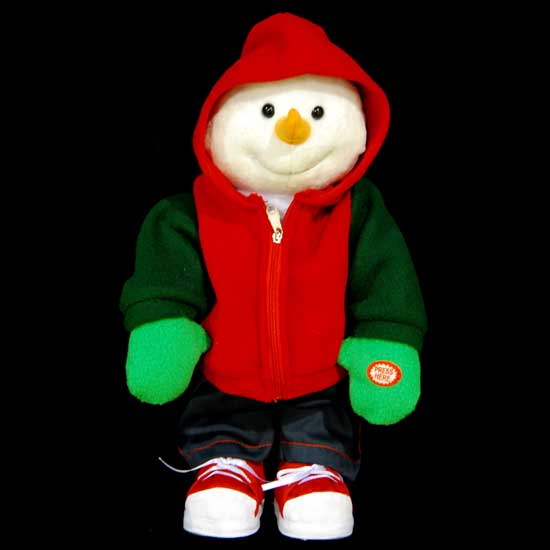Highlighted here is a plush toy with a snowman design. It is operated by four AA batteries, sings songs and dances. The plush snowman is dressed in a hooded jacket for added cuteness.