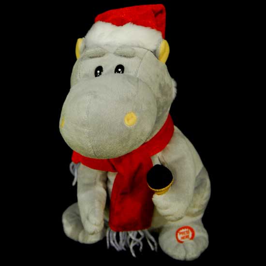 As shown is a battery-operated plush toy featuring a lovable hippo. This cute buddy delights your kid with tuneful singing and amazing dances. It is also trimmed with a Christmas hat and a fringe scarf in red.