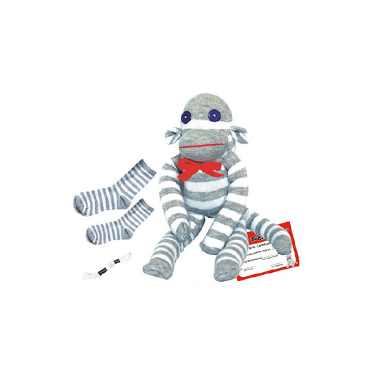 This is a plush toy in a monkey shape. The monkey is beautifully adorned with striped patterns and an eye-catching bowtie to grab your attention. A pair of socks in matching colors is included.