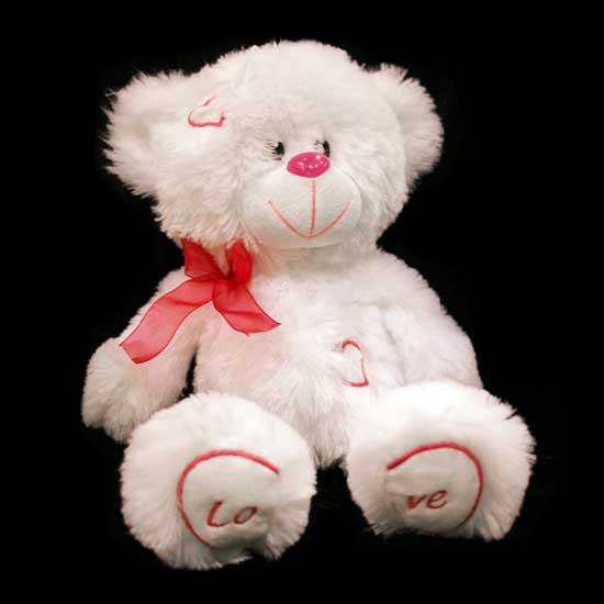 This toy animal in white is adorned with a ribbon bow, heart-shaped patterns and letters of “Love” in pink. The plush appearance ensures a soft and comfortable touch. This appealing toy animal is fitted with a string for easy hanging.