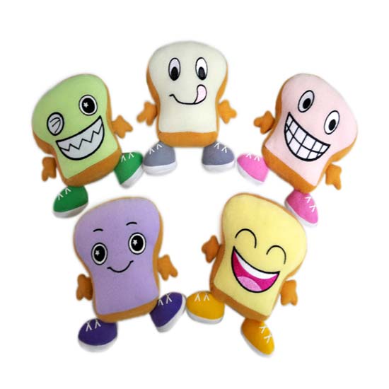 This dog toy features a baby toast design with an embroidered smiling face. The sharp colors of the toy catch pets' attention easily. Pets will love playing with this toy as it gives out squeaky sounds when pressed.