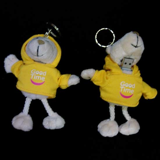 The plush USB driver features a teddy bear with a USB driver embedded in the head. The plush goes with a keychain on the top for attaching to bags. It ensures convenience and portability.
