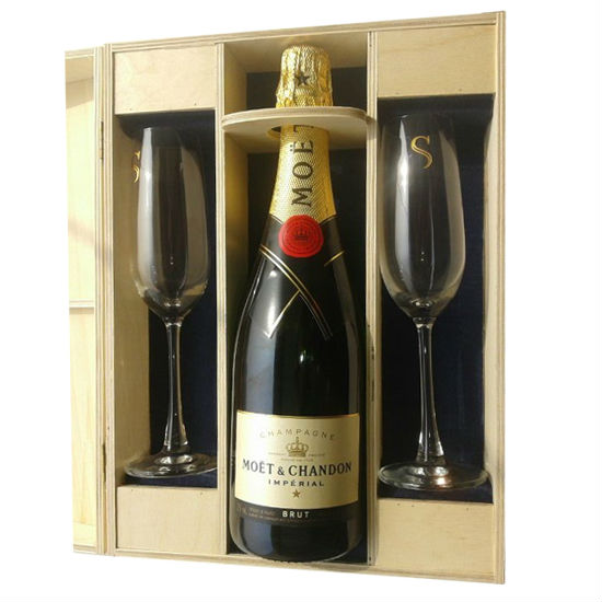 Displayed is an exquisitely designed gift box that opens to reveal your choice of wine and glasses. Made of birch plywood, the wine packaging box is durable and beautiful for a rustic look. Coming with a black satin-lined interior, this wooden wine box can hold a bottle of wine and 2 champagne flutes with extra security. Perfect for birthdays, weddings and anniversaries, this one-of-a-kind wine gift is the most impressive way to dote upon any lover of fine wine.
