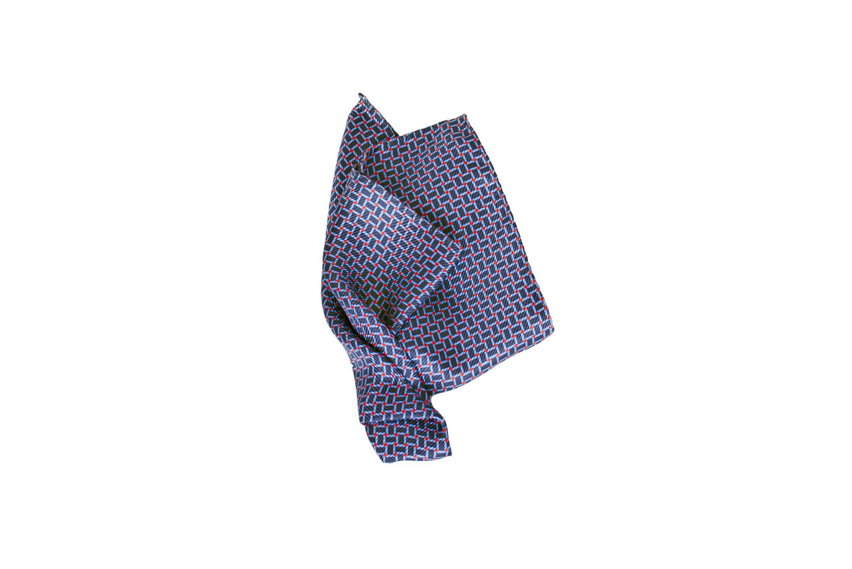 Add a charming touch to your black attire with this pocket square. The navy background is adorned with geometric prints for low-profile elegance, allowing you to wear  in any way you want with ease and flair. Premium quality is guaranteed by the finest silk and handmade craftsmanship, making it a perfect fall-winter wardrobe essential.