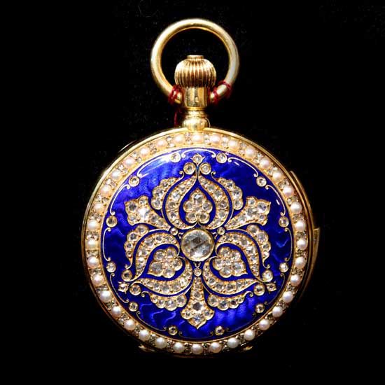 The presented pocket watch is well set with luxurious 18K gold. It is accented with diamonds and pearls for added brilliance. This gorgeous pocket watch is specially made for the Indian market.