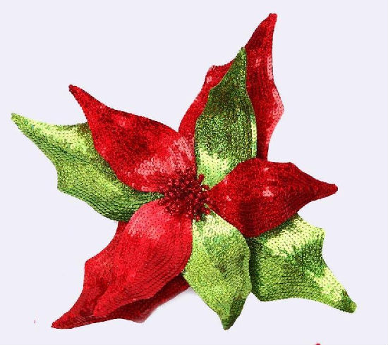 Displayed is a handmade Poinsettia embellished with metallic red sequins. The bracts of Poinsettia are in red and green and both are gorgeously made of little pieces of sequins.