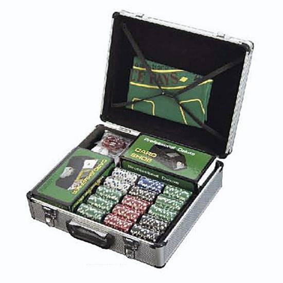 The all-in-one poker chip game set features rolls of poker chips, a card shoe, a card shuffler, dice and a game board. They are packed in a suitcase with a lock and a handle for easy storage and carrying. This poker chip set brings endless entertainment and excitement for a large group of people.