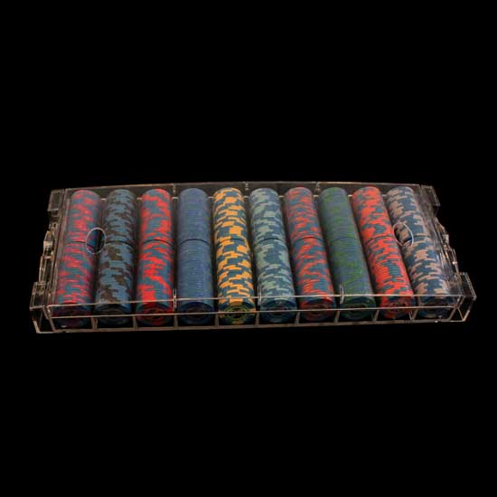Featured here is a set of poker chips in assorted colors. The top-quality poker chips are made of quality ceramic for durable use. The chip set comes with a transparent plastic box for easy organization.