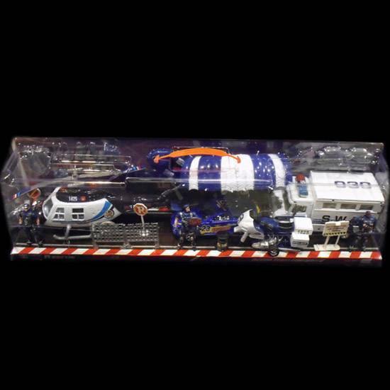 The featured set comes with different vehicles used by the police force, including a helicopter, a motorbike and a police truck. The set has policeman figurines and some roadsigns. It certainly is a good entertainment for little boys.