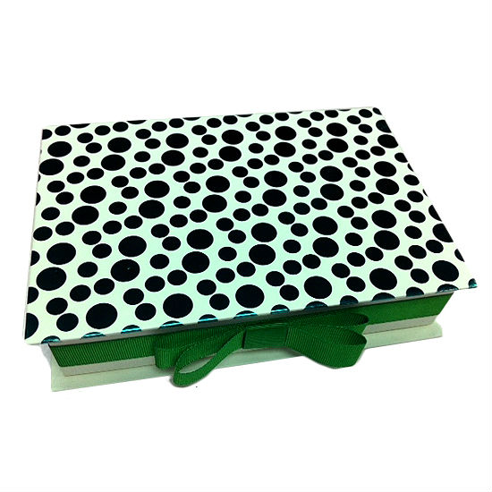 • Green ribbon bow wrapped around the box.