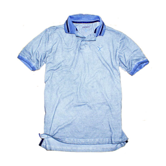 Shown here is a short-sleeve polo shirt for men. The shirt comes in light blue, featuring a washed effect. The cuffs and collar are designed with blue-and-black stripes for enhanced style.