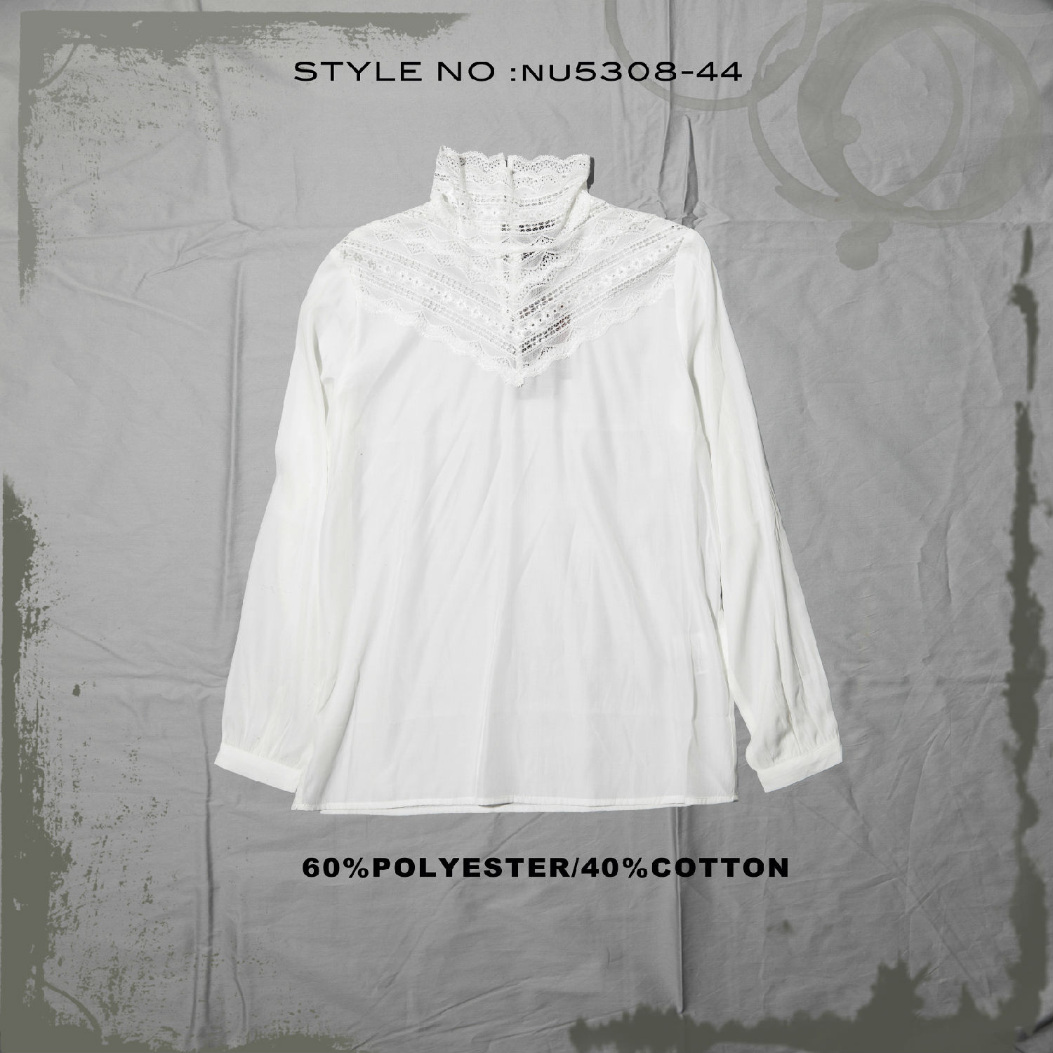 • Ladies long sleeve poly rayon mix blouse with lace collar and sleeve.