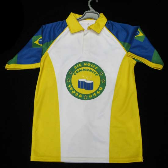This polyester sportswear features an eye-catching fluorescent yellow and blue complexion, coming with the Brazil national flag on each short sleeve. The sportswear goes with a polo collar and buckles, with a digital-dye sublimated image at the front.