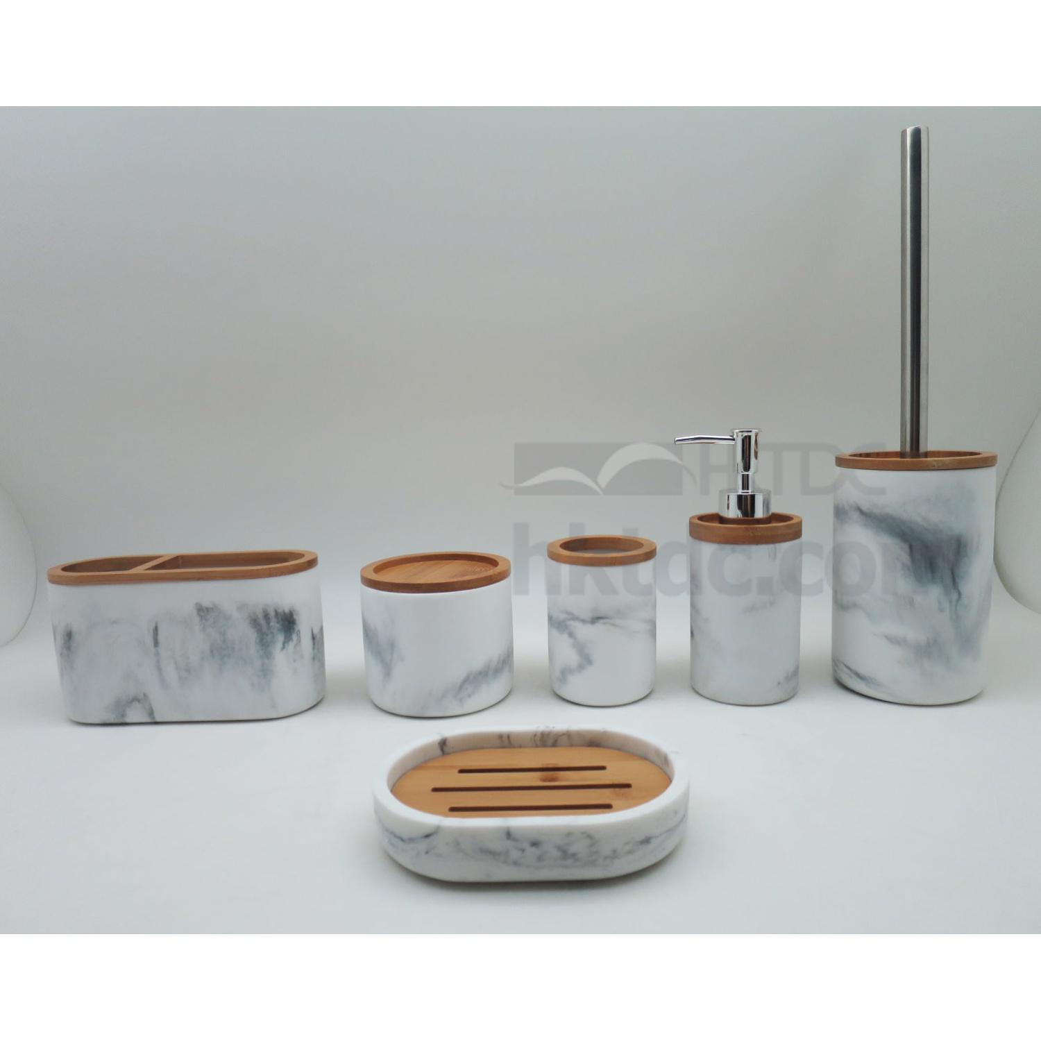 Polyresin Bath Accessories Sets W/Marble Effect & Bamboo Top