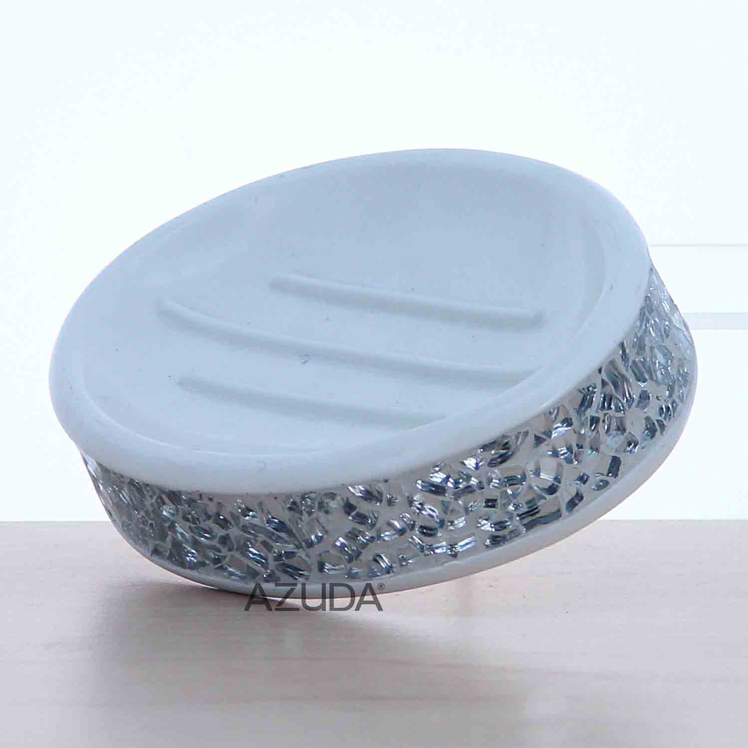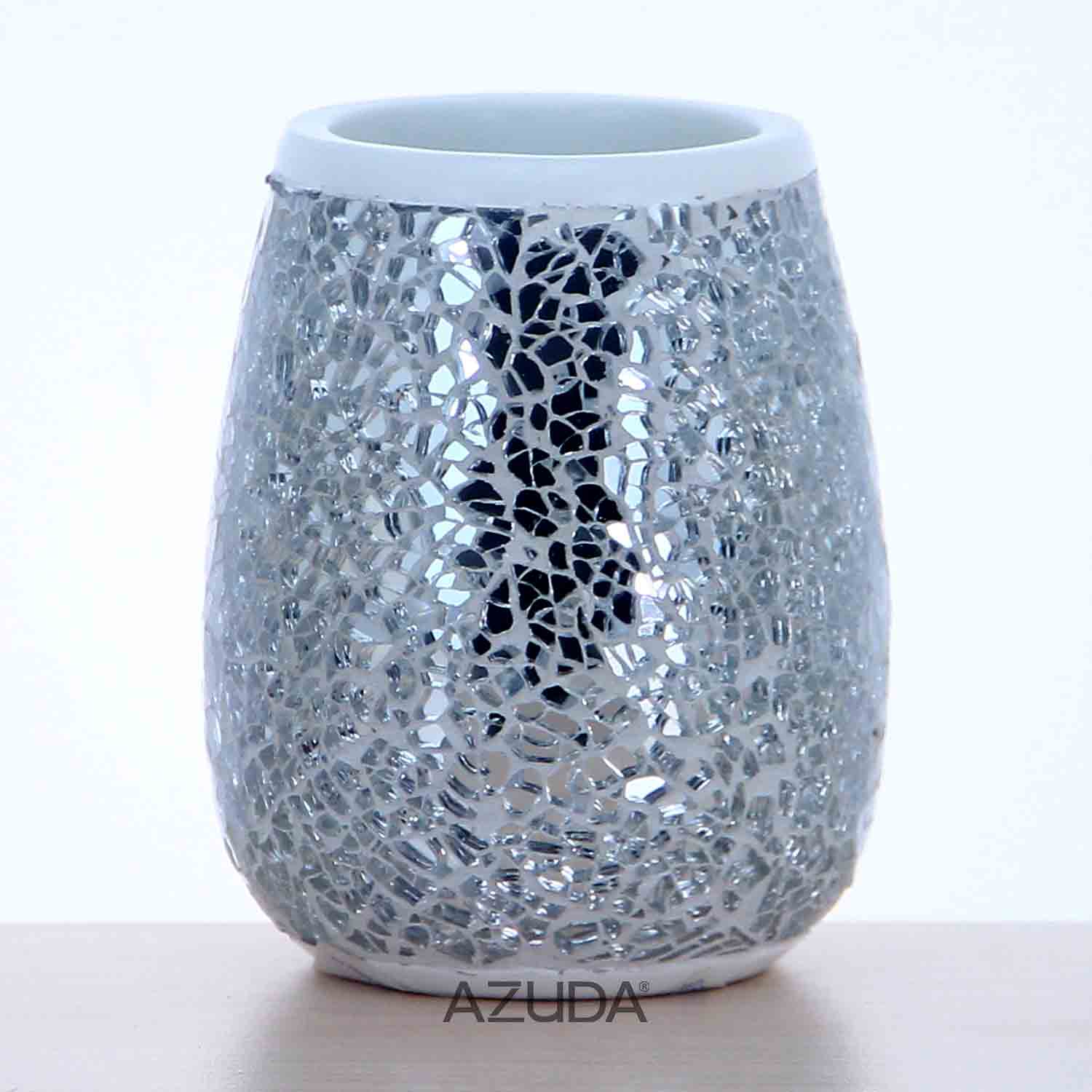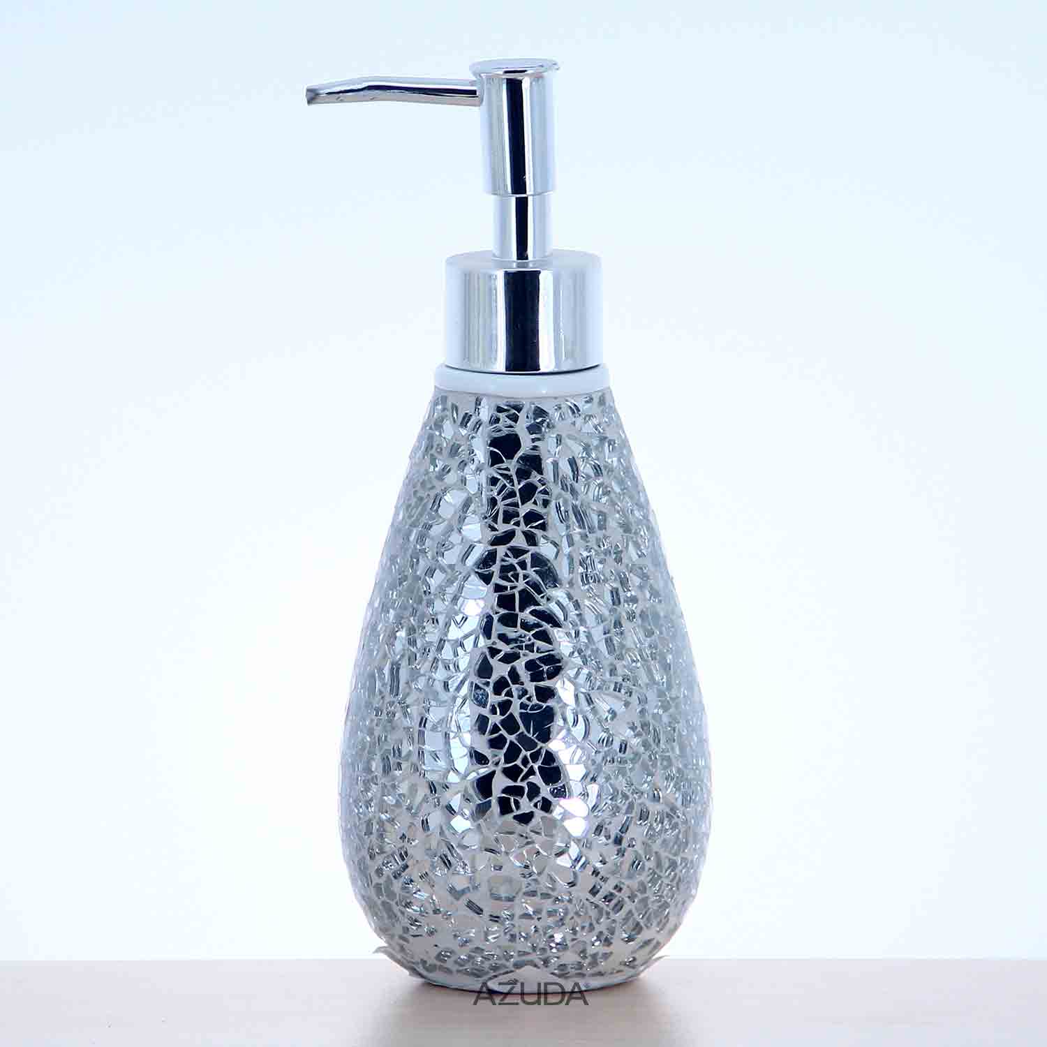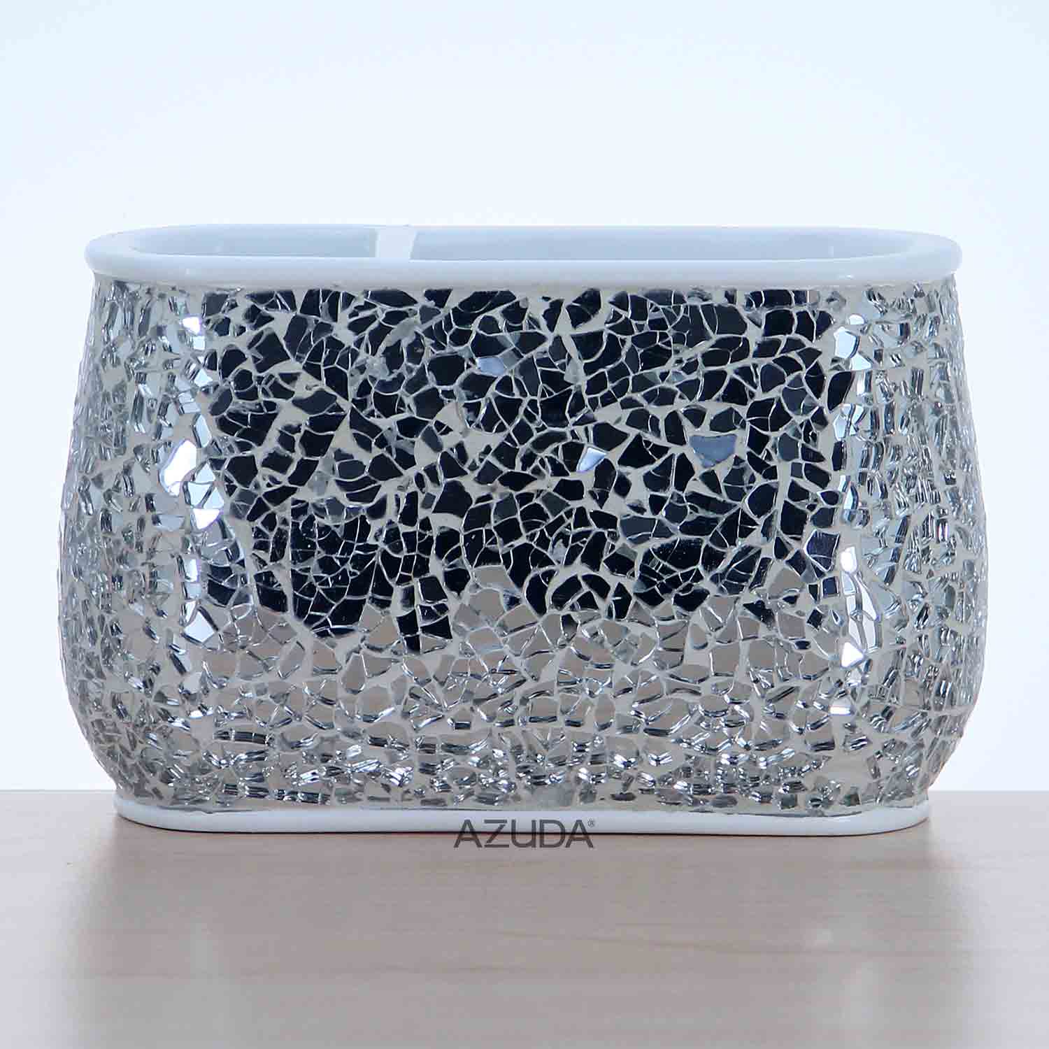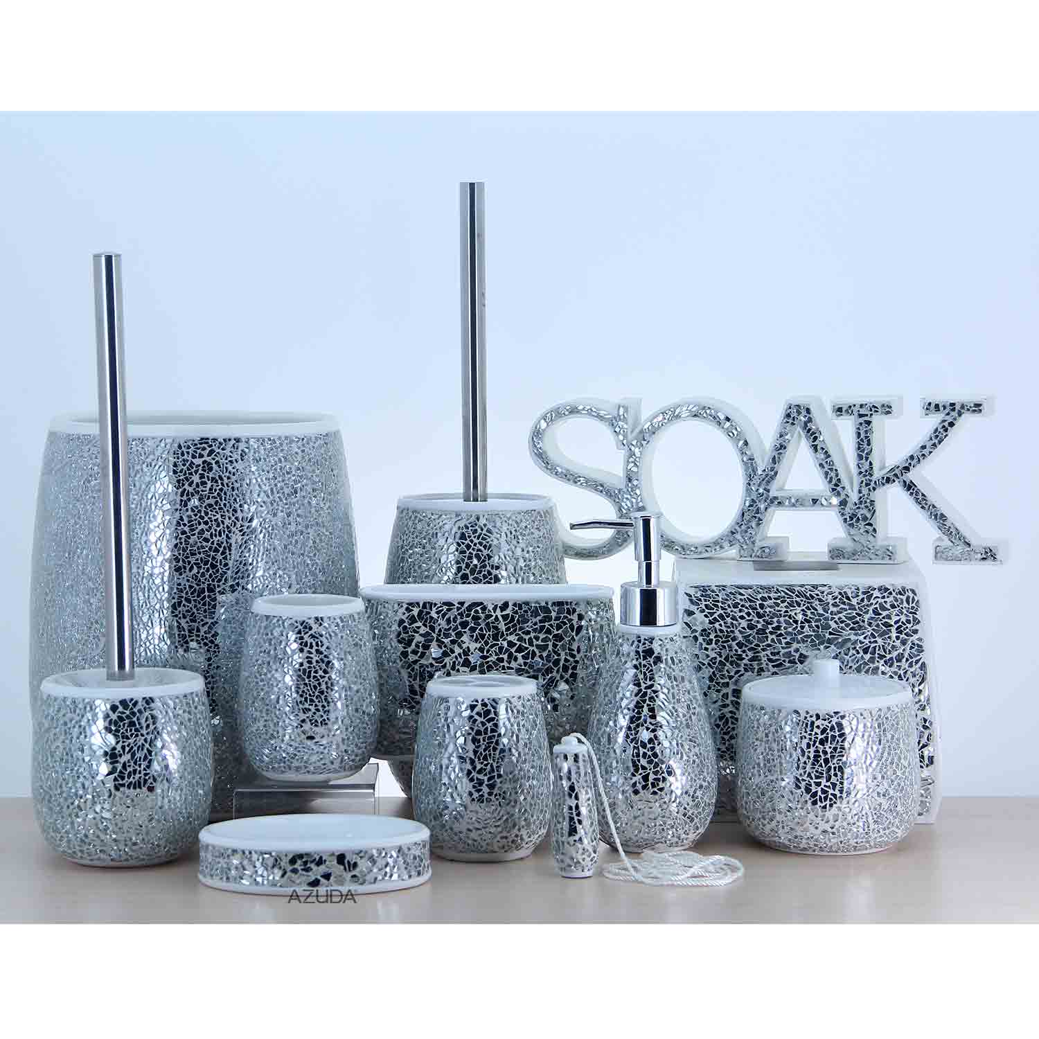 - Polyresin / Glass bathroom accessories including lotion dispenser, toothbrush holder, tumbler and soap dish. Glass fragments collage give you sparkling reflection. With these bathroom accessories, shower time can also be a visual enjoyment.