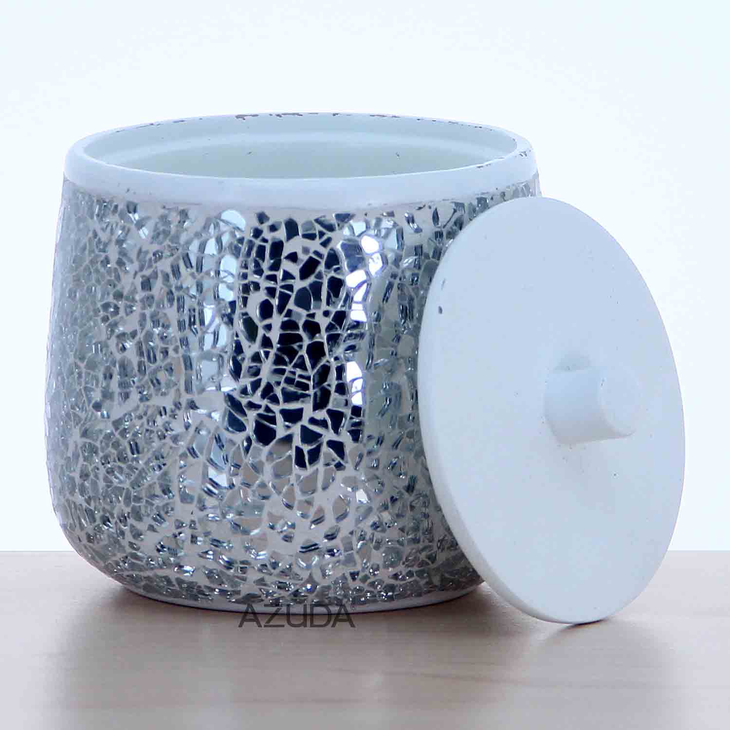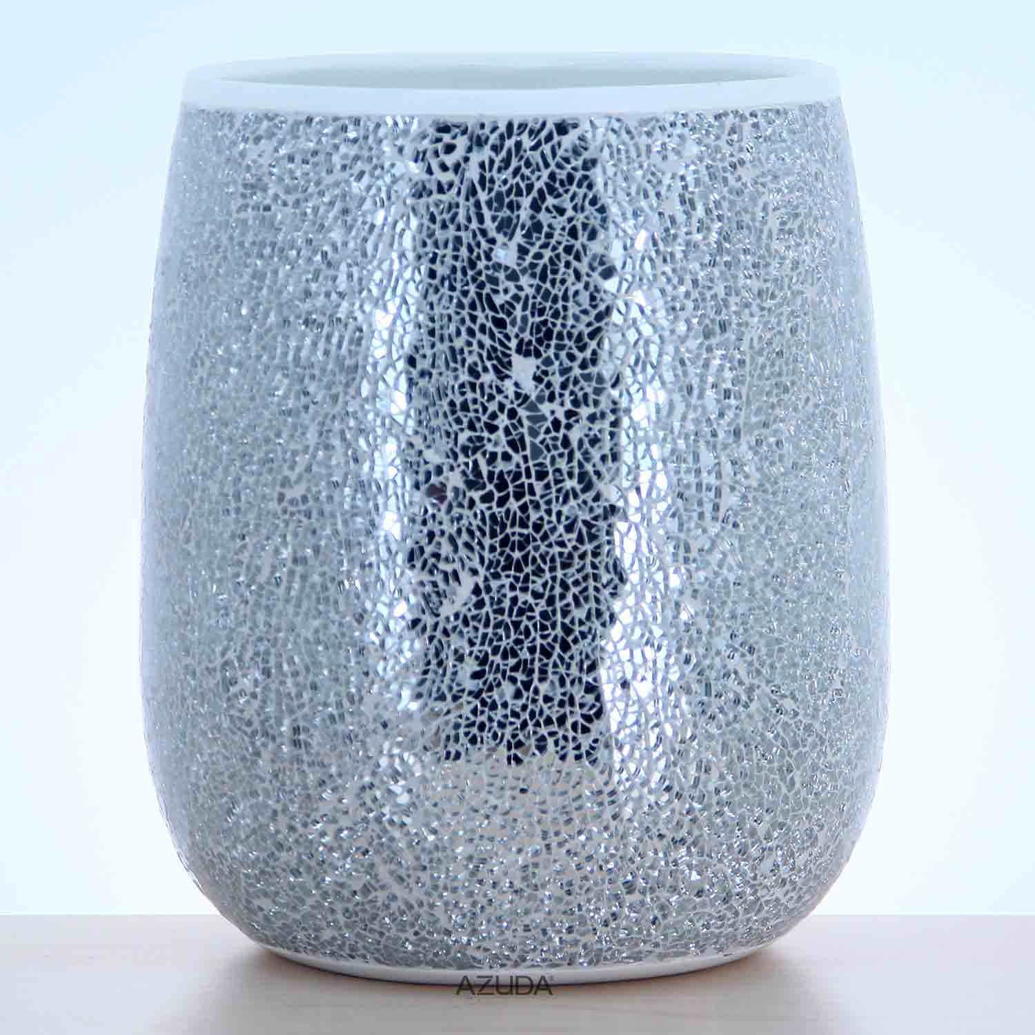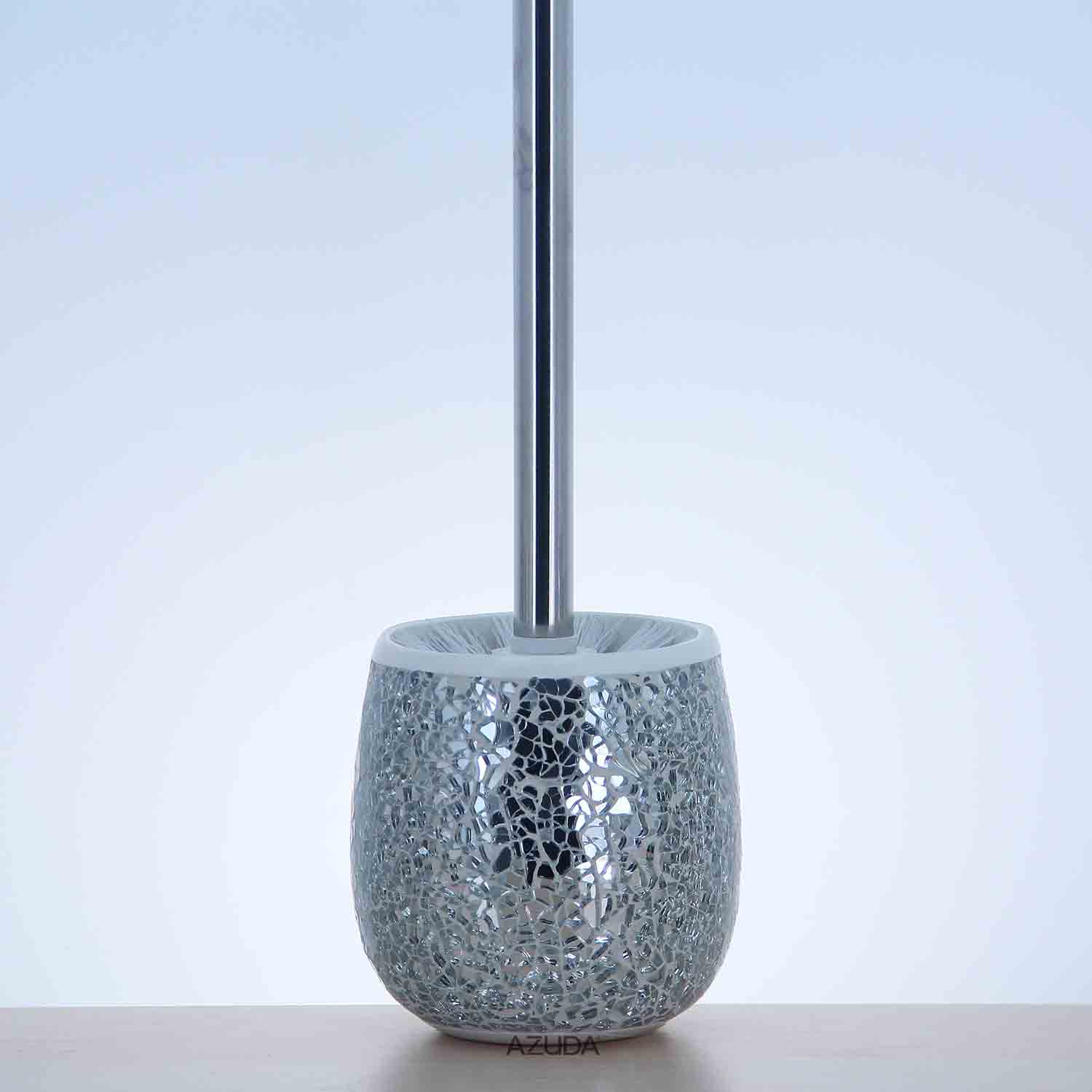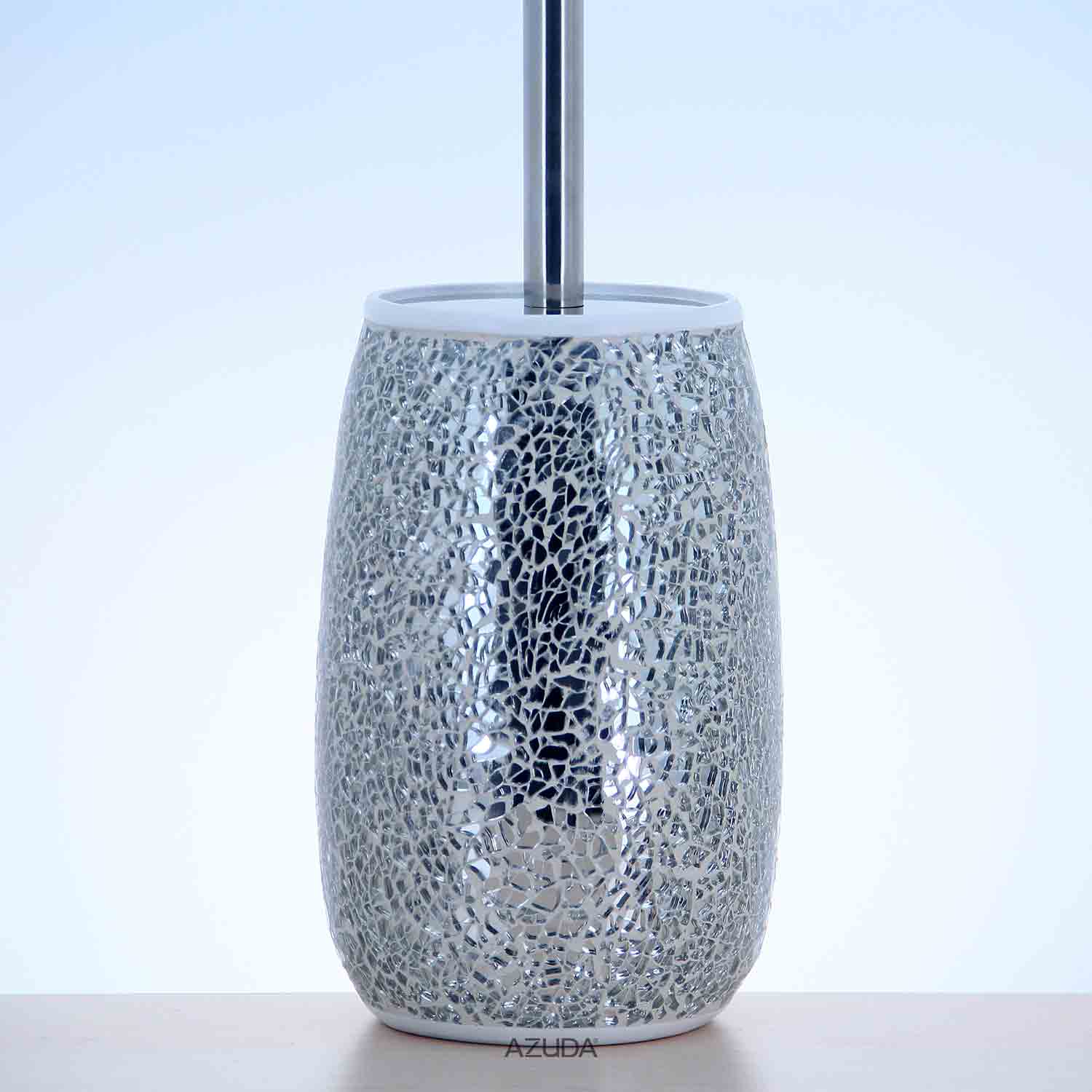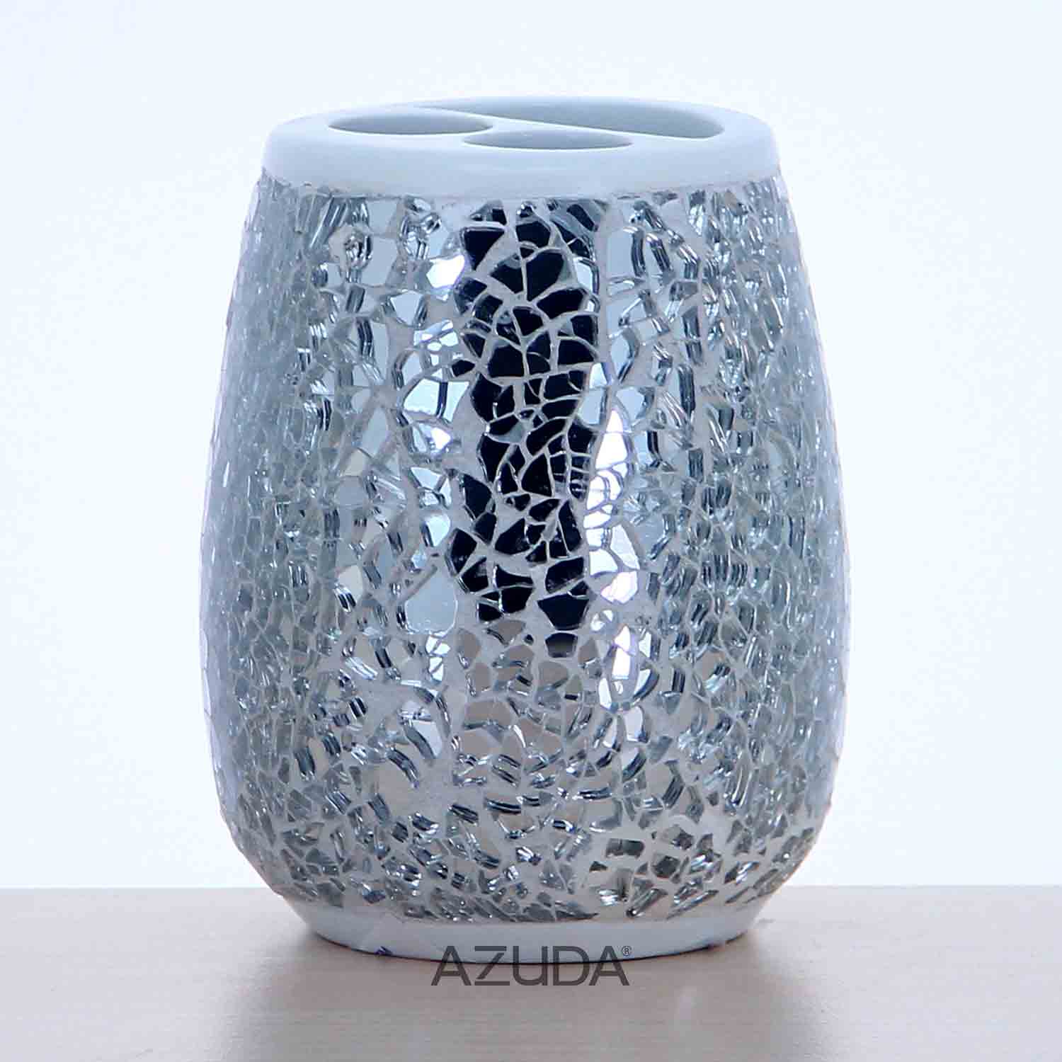 - Polyresin / Glass bathroom accessories including lotion dispenser, toothbrush holder, tumbler and soap dish. Glass fragments collage give you sparkling reflection. With these bathroom accessories, shower time can also be a visual enjoyment.