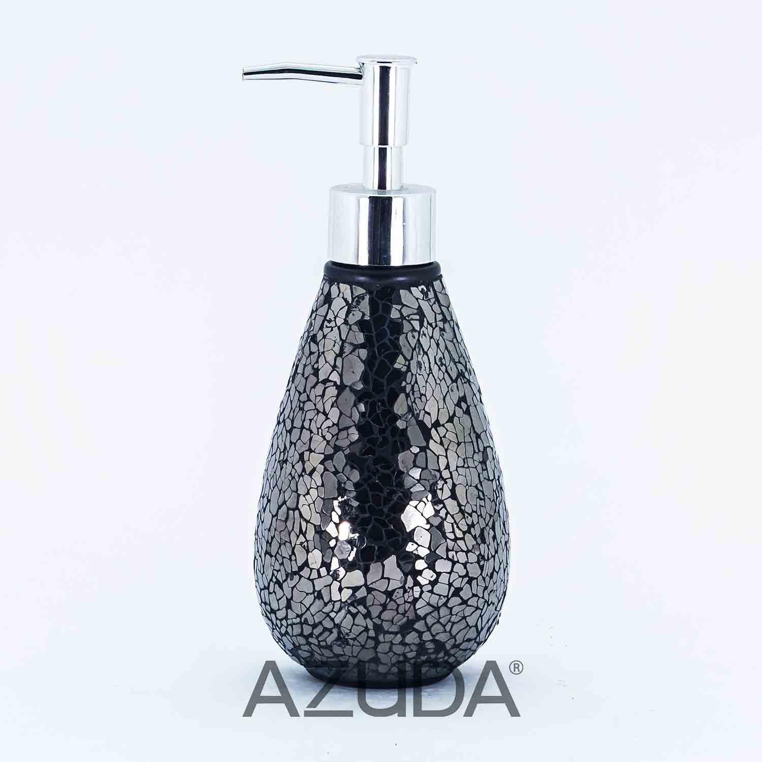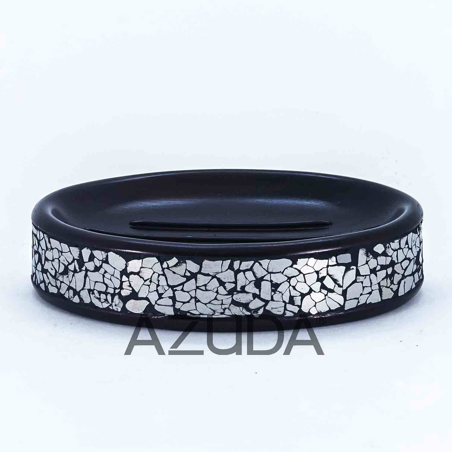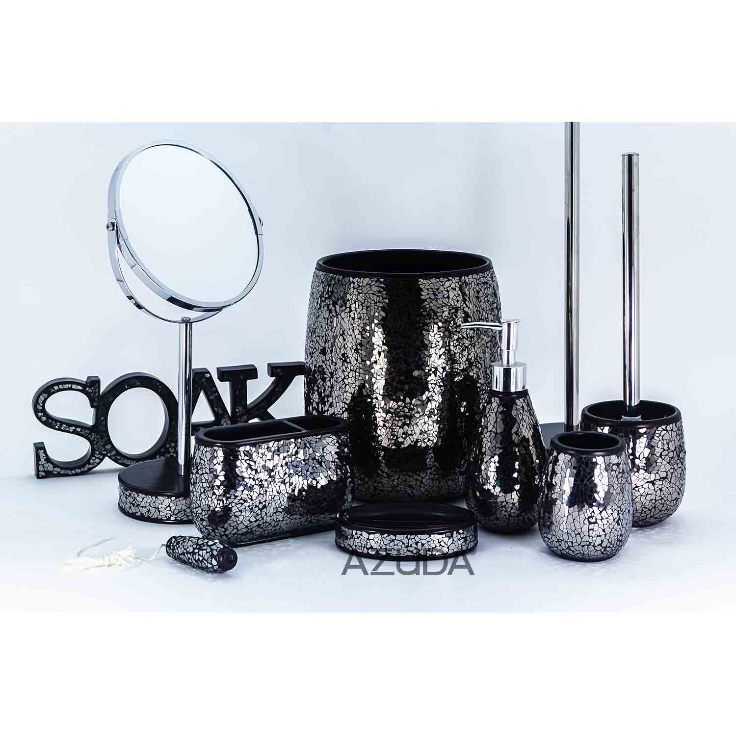 - Polyresin / Glass bathroom accessories including lotion dispenser, toothbrush holder, tumbler and soap dish. Glass fragments collage give you sparkling reflection. With these bathroom accessories, shower time can also be a visual enjoyment.