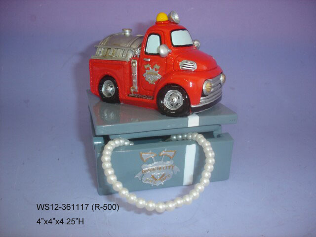 This rectangular jewelry box is designed to be space-efficient while offering ample space to store your little treasures. The lid is covered with a red fire truck and the side is accented with a silvery white fire department logo. A white strap is prolonged from the lid to the side of the box for a final touch.