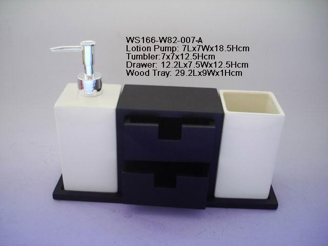 • Porcelain bathroom set with black plastic include lotion pump, tumbler, brush holder, drawer, wood tray.