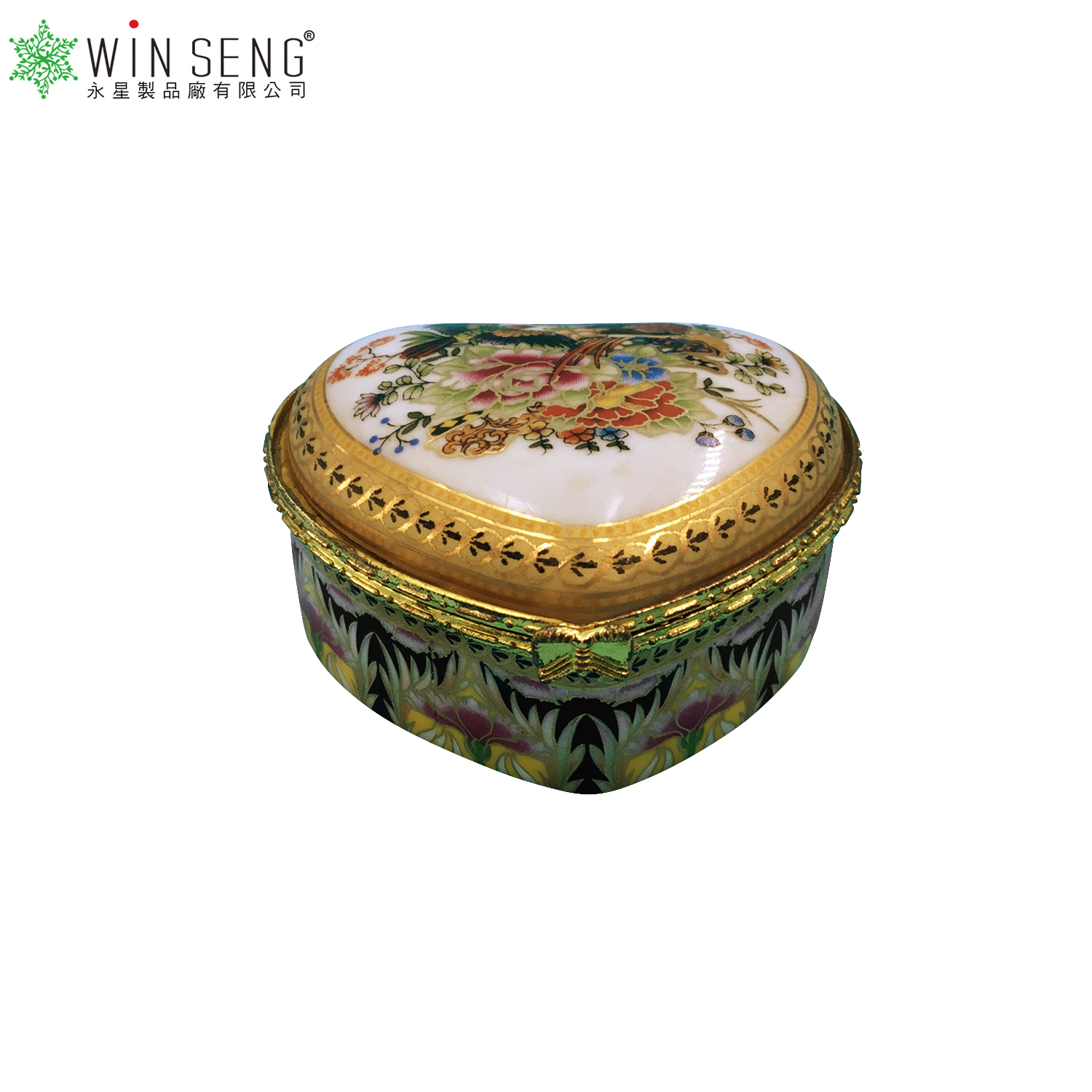 Bring an oriental air to your bedroom with this porcelain jewelry box. Rendered in a heart shape, this trinket box features a pair of birds amid many delicate and blossoming flowers, so it resembles a finely drawn Chinese painting. To lend a sumptuous air to the piece, the florals are topped off with sheeny traces and outlines in a luxurious color. Finished off with a bottom box overwhelmed by floral patterns, this opulent and refined trinket box would bring an oriental and opulent aura to your bedroom.