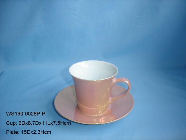 Displayed is a classic coffee mug set with shiny pink finish. The coffee mug features a contoured handle with flared brim, matching with a round saucer as a beautiful drinkware set. It is ideal for serving various hot beverages in grand occasions.