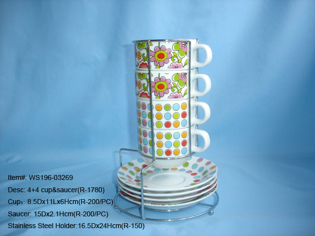 • 4+4 porcelain coffee cup and saucer with stainless steel holder.