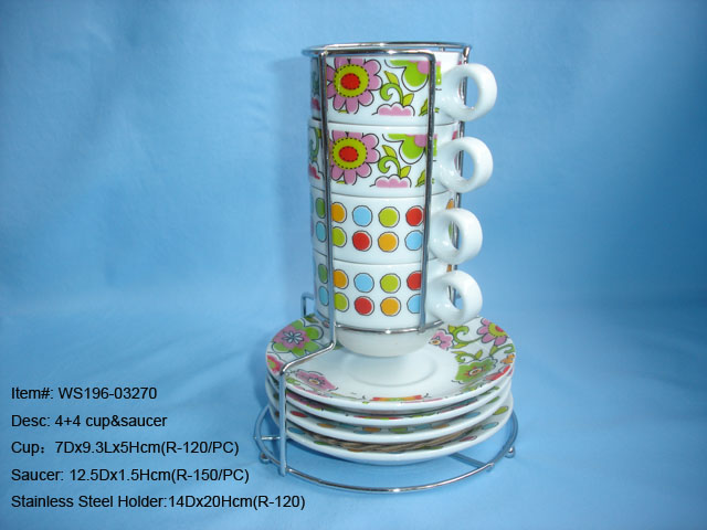 • 4+4 porcelain coffee cup and saucer with stainless steel holder.