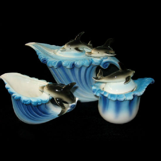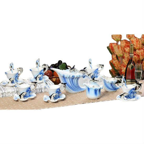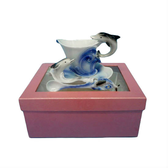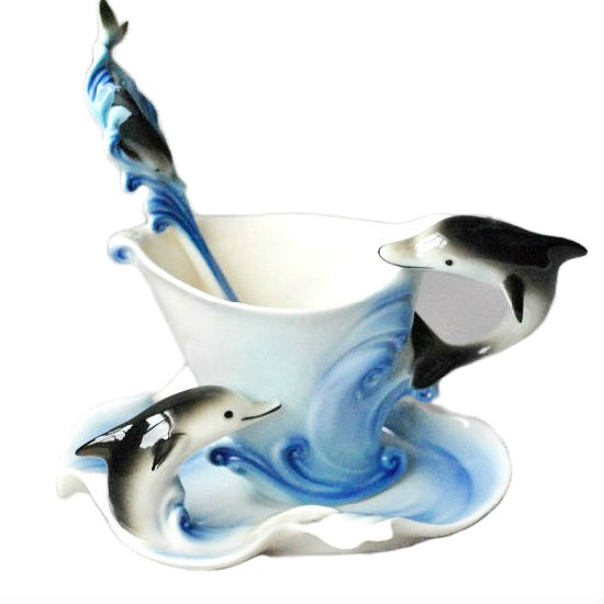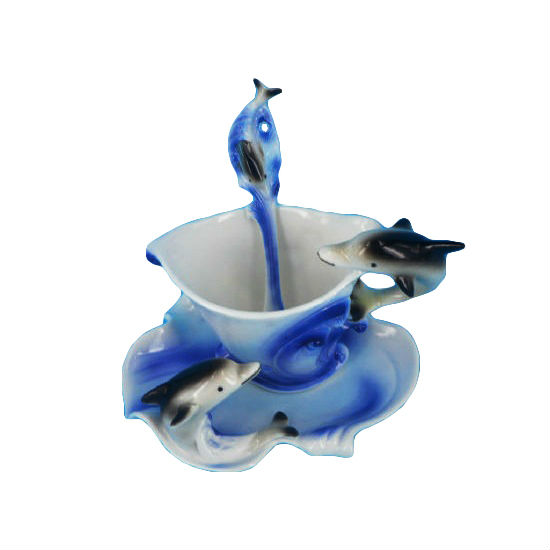 This top-quality porcelain dolphin-shaped cup set is made with exquisite craftsmanship. Each cup, saucer and spoon has one vivid dolphin on it. The cup set is a fabulous gift and premium for all occasions.