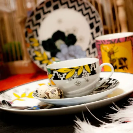 The soft black geometric patterns set within the sprawling tropical flowers give a dramatic combination that black is a friendly colour to match anything at home.