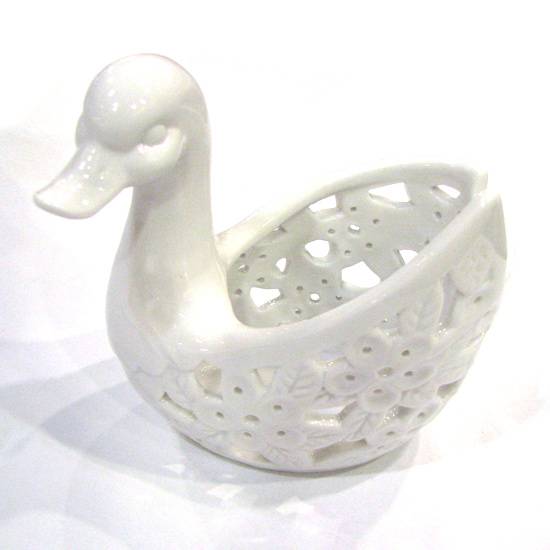 This is a porcelain decoration which has a duck shape with an openwork body. It can be used to hold small objects such as snacks on tea tables or desks.