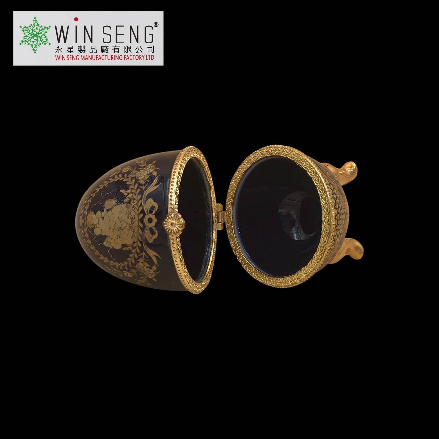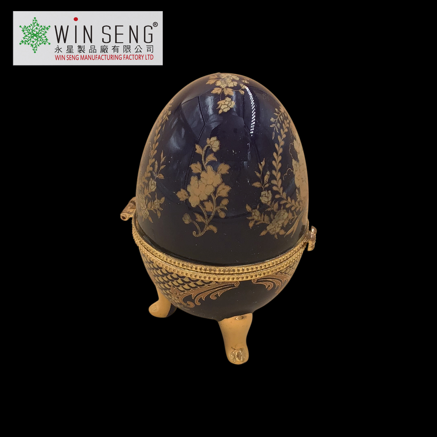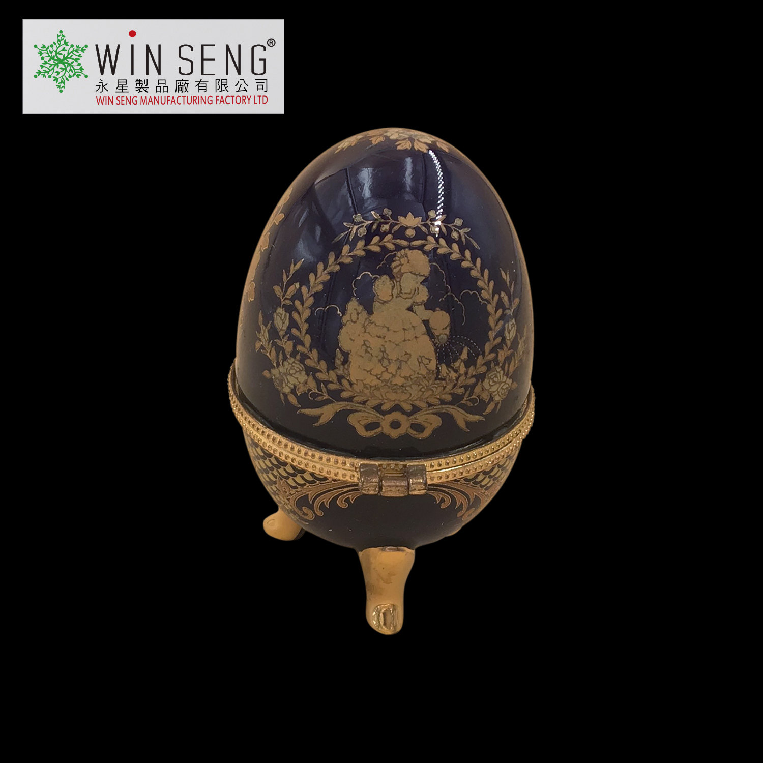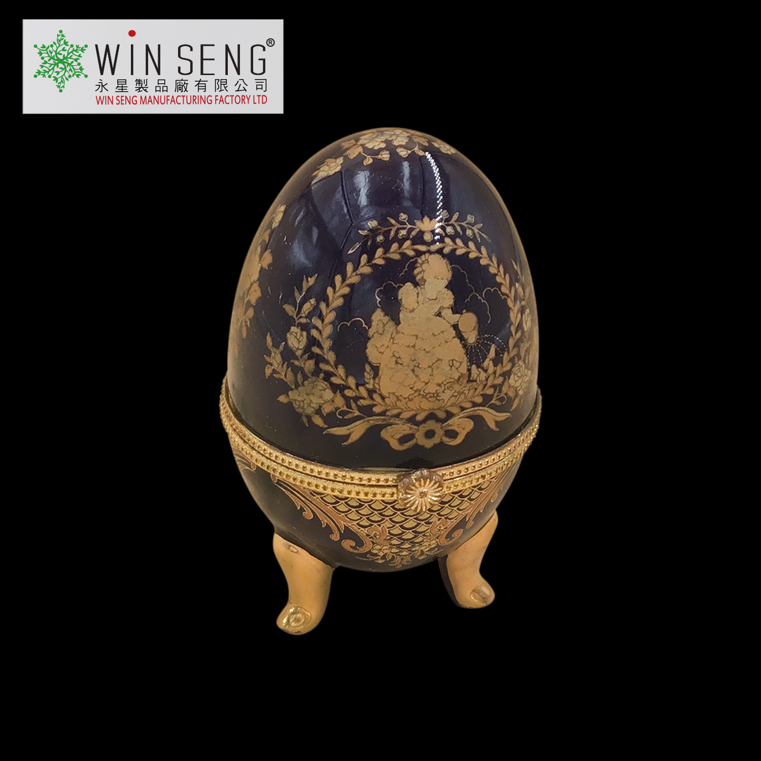 Seems like a relic from long-gone eras, this porcelain egg-shaped jewelry box features intricate and refined patterns of various sorts for an antique, mysterious and elegant appeal. On the trinket box sets a faint silhouette of a lady in a long dress watering a leaf wreath around her for a vintage-y and graceful look. Round the box also features various floral patterns and a refined and classic print at the bottom box that best reflect its fine artistry. Matched to the masterfully crafted designs are gold-tone details and legs for that luxurious and mysterious touch. Bring an antique and captivating aura to your vanity with this enchanting and mesmerizing box.