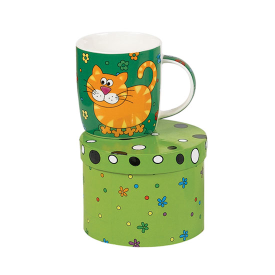 Displayed is a porcelain mug coming with a cat image for a lovable appearance. It can hold water, juice and other beverages for consumption. It is fitted with a large handle for easy holding.