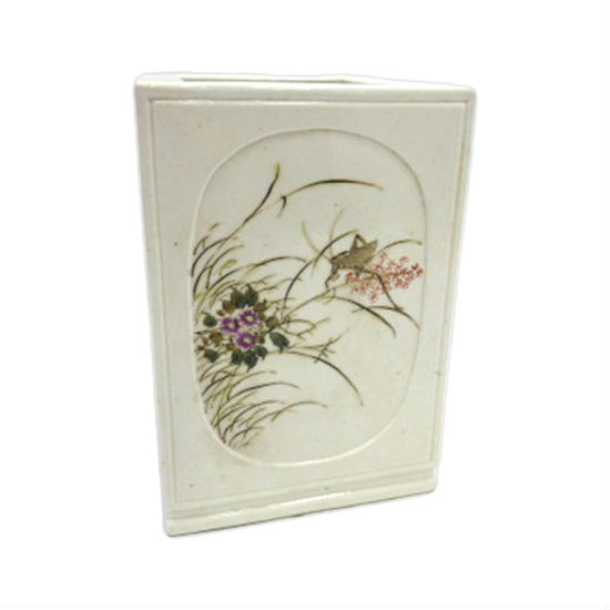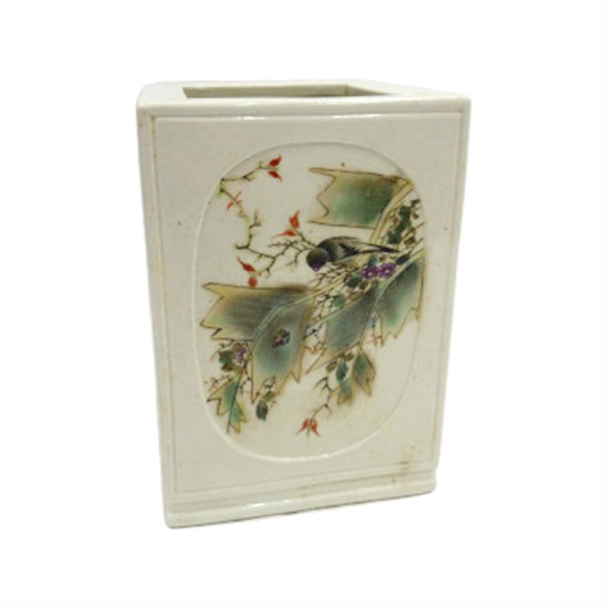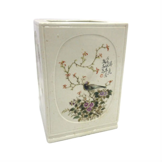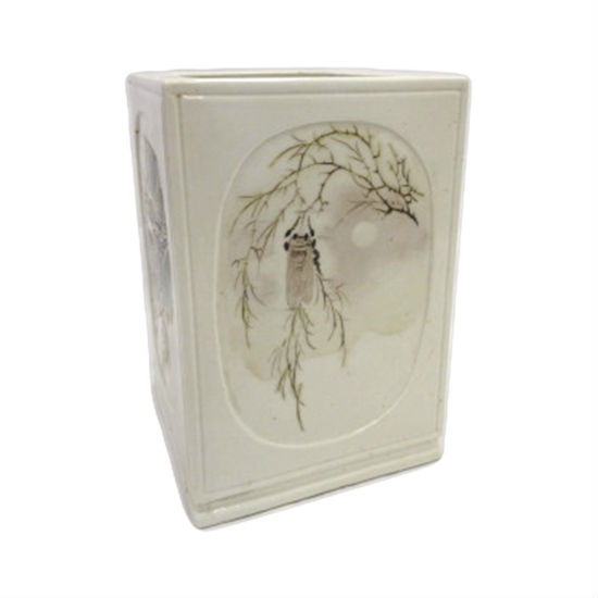 Introduce a classic and oriental touch to your desktop instantly with this pen holder. It is finely made of porcelain and the four faces are painted with birds, flowers and insects in elegant compositions. This sophisticated piece is drawn by famous Chinese masters and is a replica in the twenties.