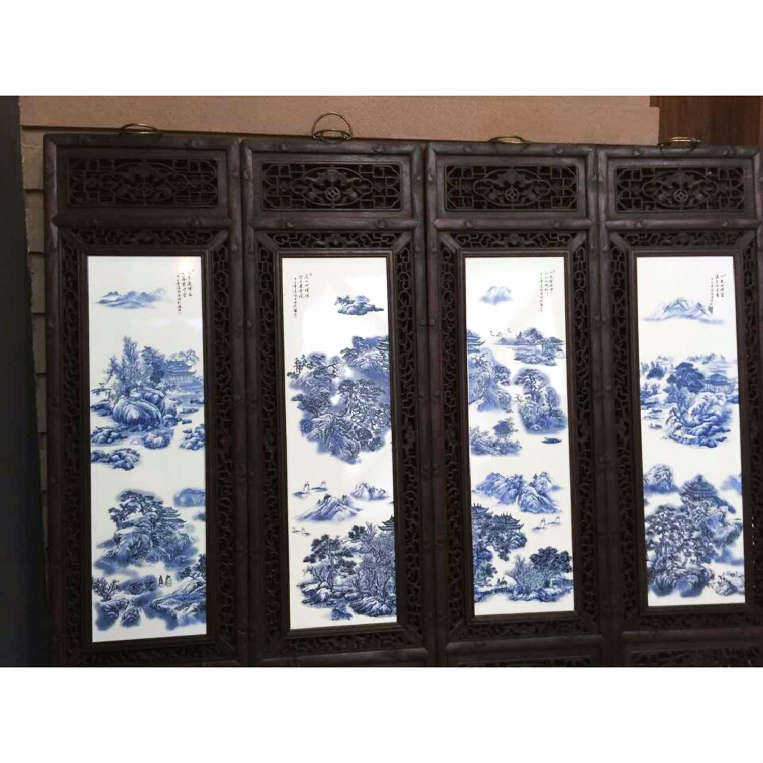This porcelain screen is the perfect combination of form and functionality. The screen features blue and white motifs of natural scenery that adds a touch of class and modernism. The dark finish on the frames gives a rich look to the panel. Sturdy and appealing, this four-panel screen is a great option for dividing spaces.