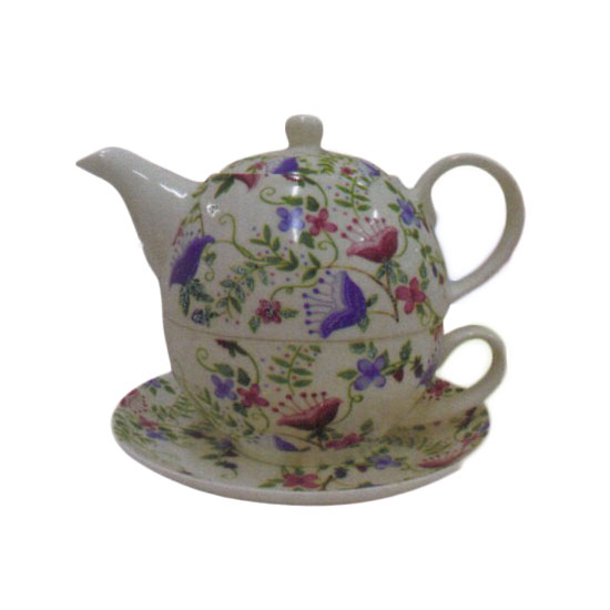 This is a tea pot set made from premium quality porcelain. The tea pot and cup can be stacked together to save space on your table. The delicate flower pattern adds a classy touch to your dining room.