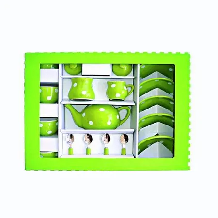 The porcelain tea set comes with 18 pieces, including teapots, cups, spoons and plates. The drinkware pieces come in a refreshing green color decorated with white dotted patterns. This exquisite tea set makes a great house warming gift item.